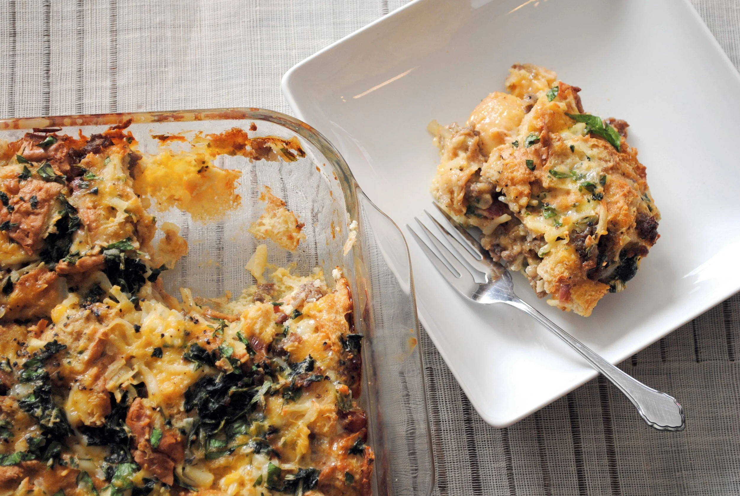 Directions:(Before you start, make sure your spinach is well drained so it doesn't make your casserole runny. The easiest way to do this is to put it in the center of a kitchen towel and then wring it out. It will end up in a little ball, but just pull it apart with your fingers.)Cook the sliced bacon either in the microwave or on the stove until crisp. (Incidentally, I've found the easiest way to cut raw bacon is with kitchen scissors.)Heat a nonstick skillet over medium high heat and cook sausage. When the sausage is about halfway cooked, add the onion. Season lightly with salt and pepper. Combine bacon with sausage and onions.In a large bowl, whisk eggs, milk, Worcestershire, ground mustard, parsley, and season with salt and pepper.In a greased 9 x 13, layer half of the bread cubes, potatoes, and cheese. Top with all of the bacon and sausage mixture and spinach. Repeat layers of bread, potatoes, and cheese. Slowly pour the egg mixture over all so everything is soaked. Cover and chill overnight.Remove from the refrigerator 30-60 minutes before baking. Bake at 325 for 60-70 minutes or until a knife inserted in the center comes out clean.You may want to serve with hot sauce, if you like that sort of thing.Enjoy!